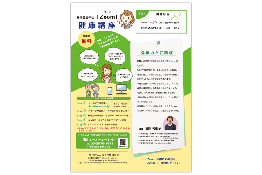 さて、早い方だと年明け早々には、花粉症の季節が始まります。本格的には春先から初夏にかけてのシーズンという方が多いかと思いますが、だからこそ季節に先駆けて体の事を知る事で、様々な対策を施す事が出来るようになります。今回の「『Zoom』健康講座」では、免疫力と花粉症について取り上げます。寒さやお天気をコントロールする事は出来ませんが、自分の体は自分次第で如何様にもコントロールする事が出来ます。花粉症の症状を無くすとまではいかないまでも、体のメカニズムを把握しておき、嫌な症状を最低限に抑える努力をしてみませんか?