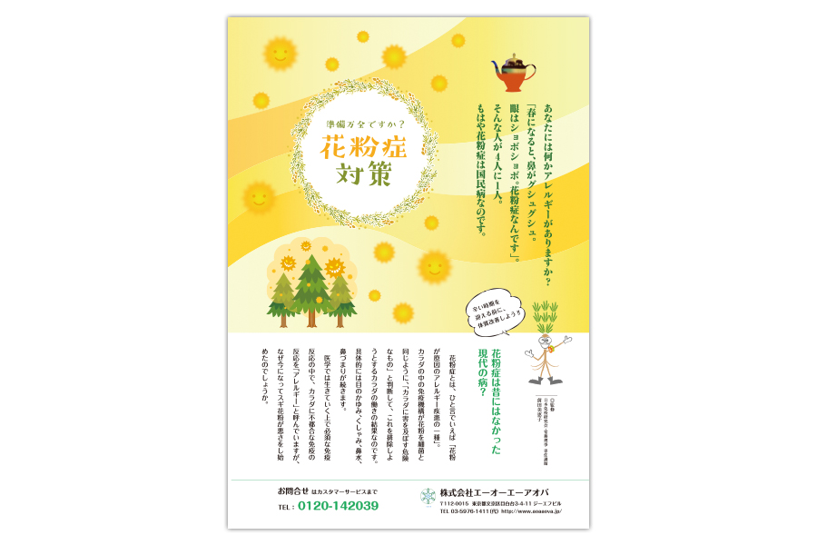急激な気温の上がり下がりで、体調を崩す人も後を絶ちません。カラダを慣らす余裕もなく、急激に季節が変化するので、ココロだけでもそのつもりで準備しておくに越したことはありませんね。エーオーエーアオバでは、早くも花粉症対策に関する情報発信を始めました。目のかゆみや辛い鼻水の嵐から、少しでも解放されるように、以下のような冊子を今年もご用意致しました。