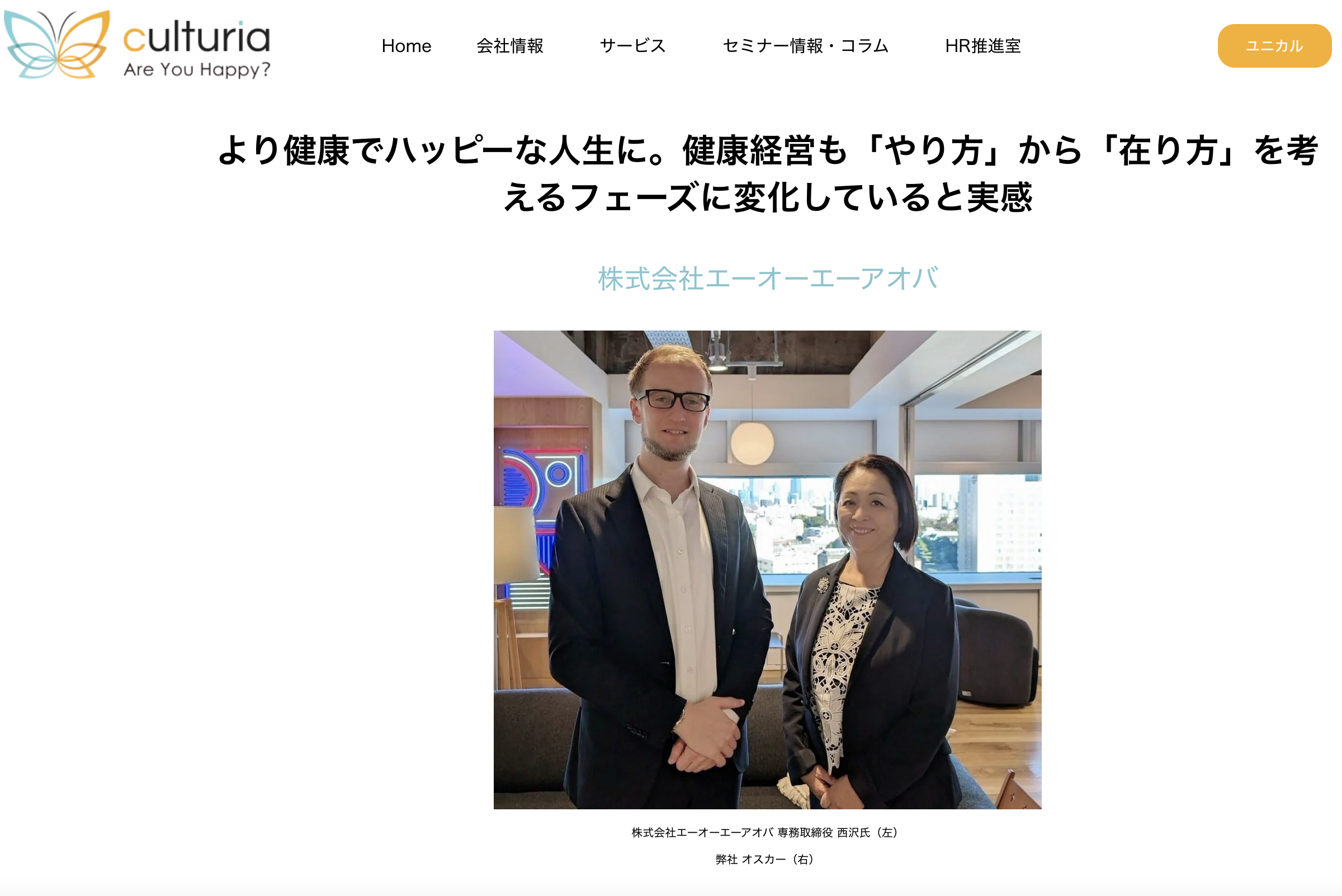 弊社専務取締役であり健康経営推進室長である西澤頼母が、「株式会社カルチャリアさん」のWebサイト内にて、健康経営に関する取り組み内容と共に紹介されました。