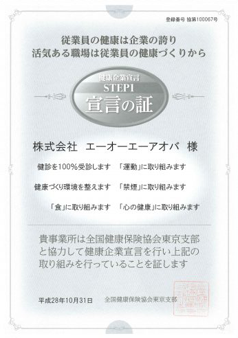 2016年、「健康企業宣言 STEP1 宣言の証」を受けました。